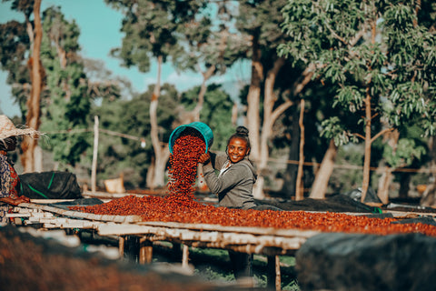 There is a washing station on the banks of the Qonqana river, a mill in the Bombe region of Ethiopia which attracts coffee growers from the surrounding area to process and wash their crop. Known as “The Mother Station” by locals, it’s the first and largest project by Daye Bensa Coffee, a company run by brothers Asefa and Mulugeta Dukamo. These beans have been processed at the mother station and were farmed locally. After washing the beans and processing them using environmentally friendly machinery, they are dried in the open air until they are ready to be sold.